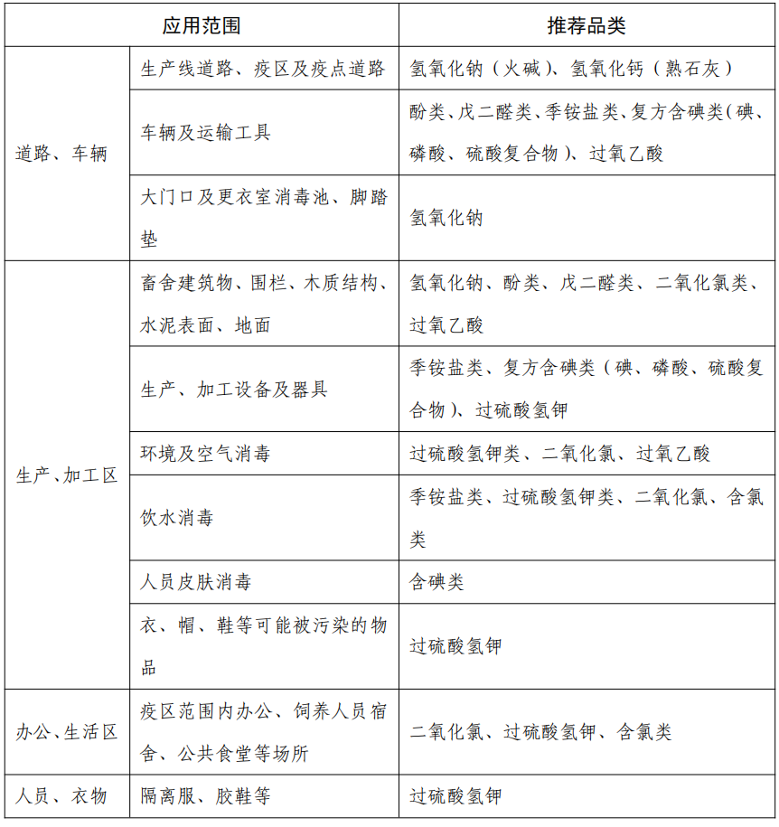 备注:1.氢氧化钠、氢氧化钙消毒剂,可采用1%工作浓度;2.戊二醛类、季铵盐类、酚类、二氧化氯消毒剂,可参考说明书标明的工作浓度使用,饮水消毒工作浓度除外;3.含碘类、含氯类、过硫酸氢钾消毒剂,可参考说明书标明的高工作浓度使用。