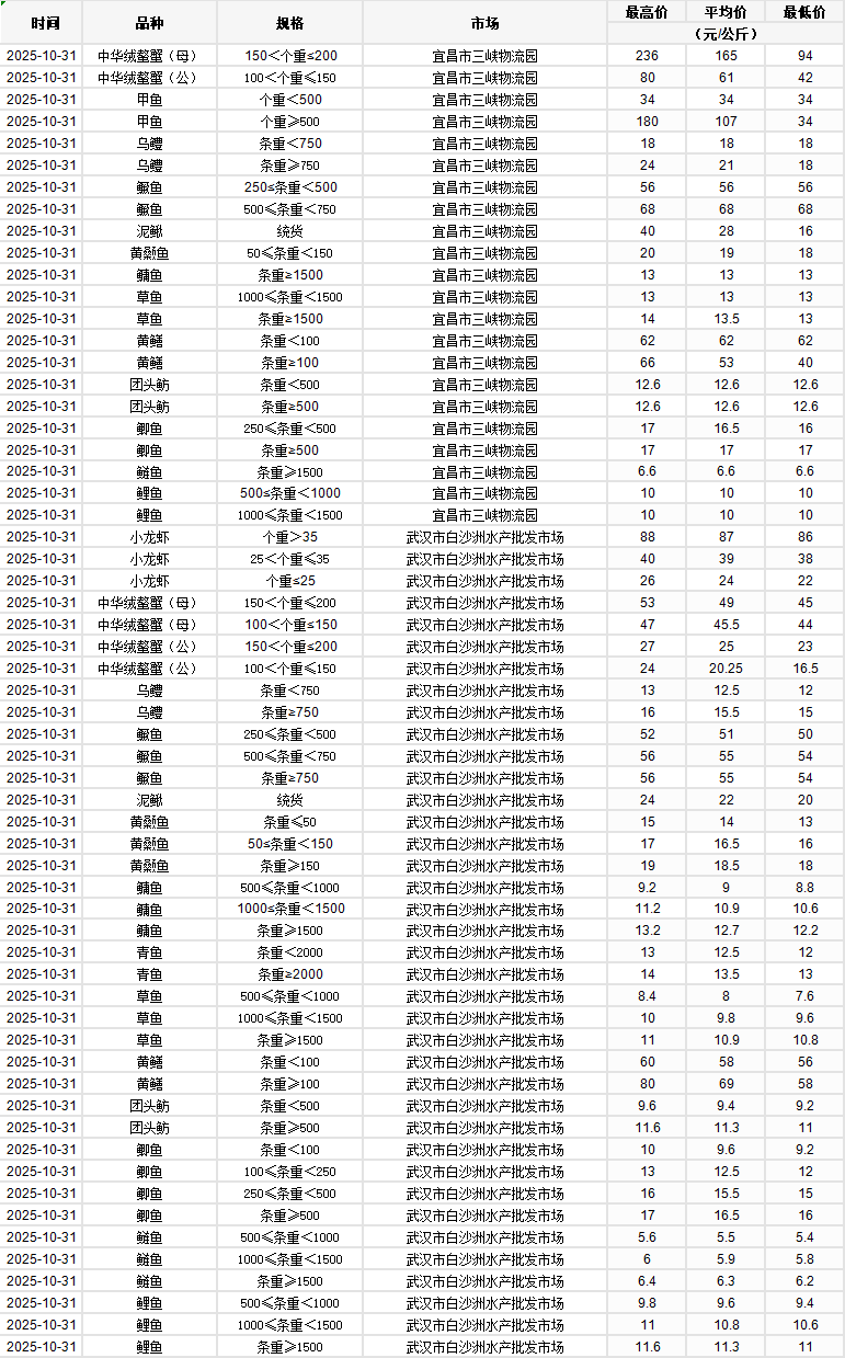 2025年10月31日行情|湖北省主要水产品价格明细