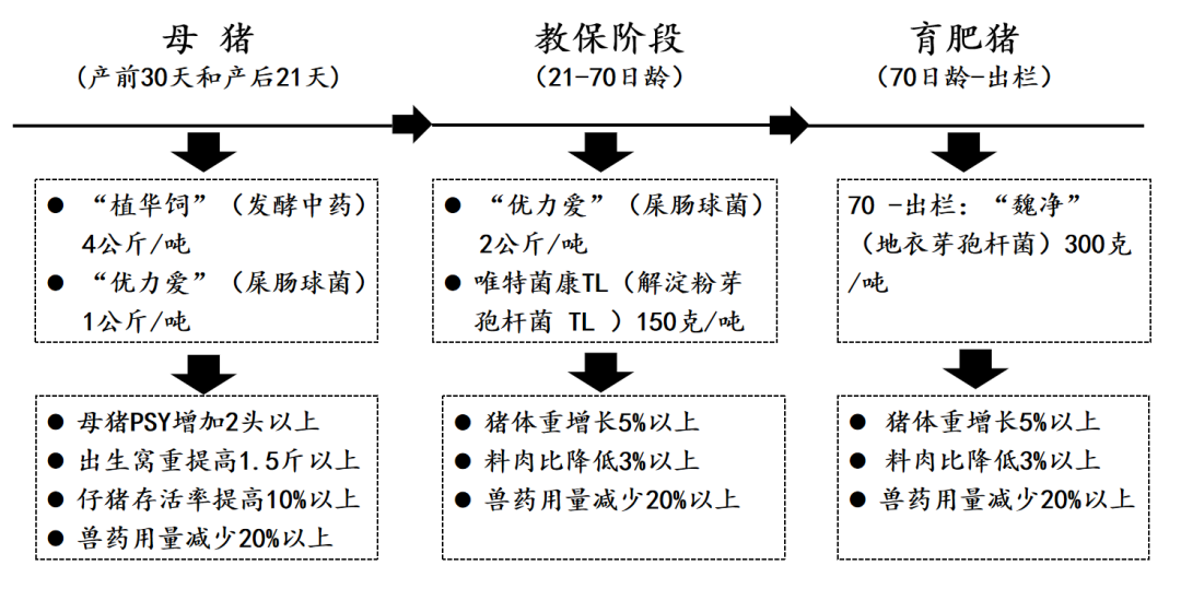 饲料中添加经特殊工艺加工而成的”优力爱”(主要成份为屎肠球菌),可以修复肠道,显著降低仔猪腹泻减少抗生素的使用。同时,使用促生长的微生态制剂“唯特菌康TL”(主要成份为解淀粉芽孢杆菌TL)弥补仔猪因消化不良带来的影响。